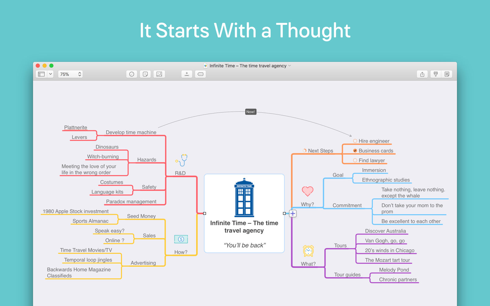 MindNode 让学生、艺术家和项目经理能轻轻松松产生灵感。