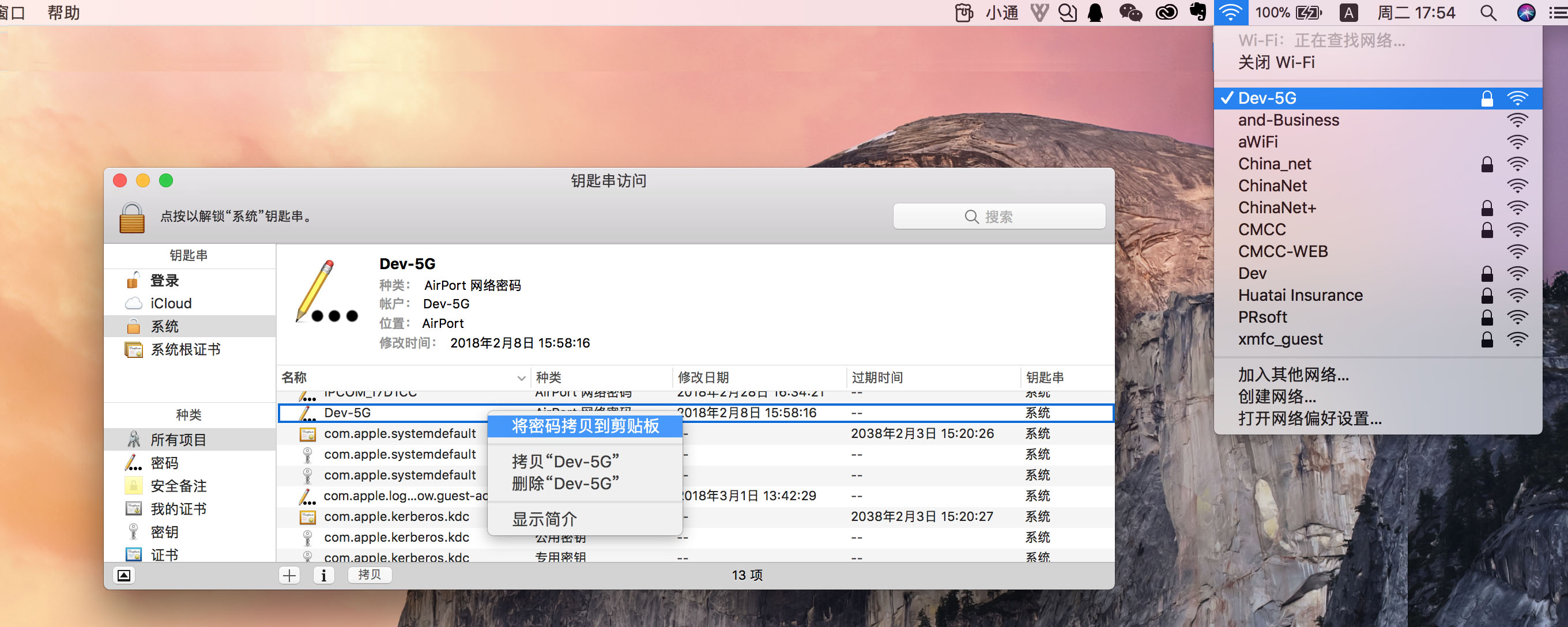 5.找到你需要连接的WiFi名称,右击,选择“将密码拷贝到剪贴板”。